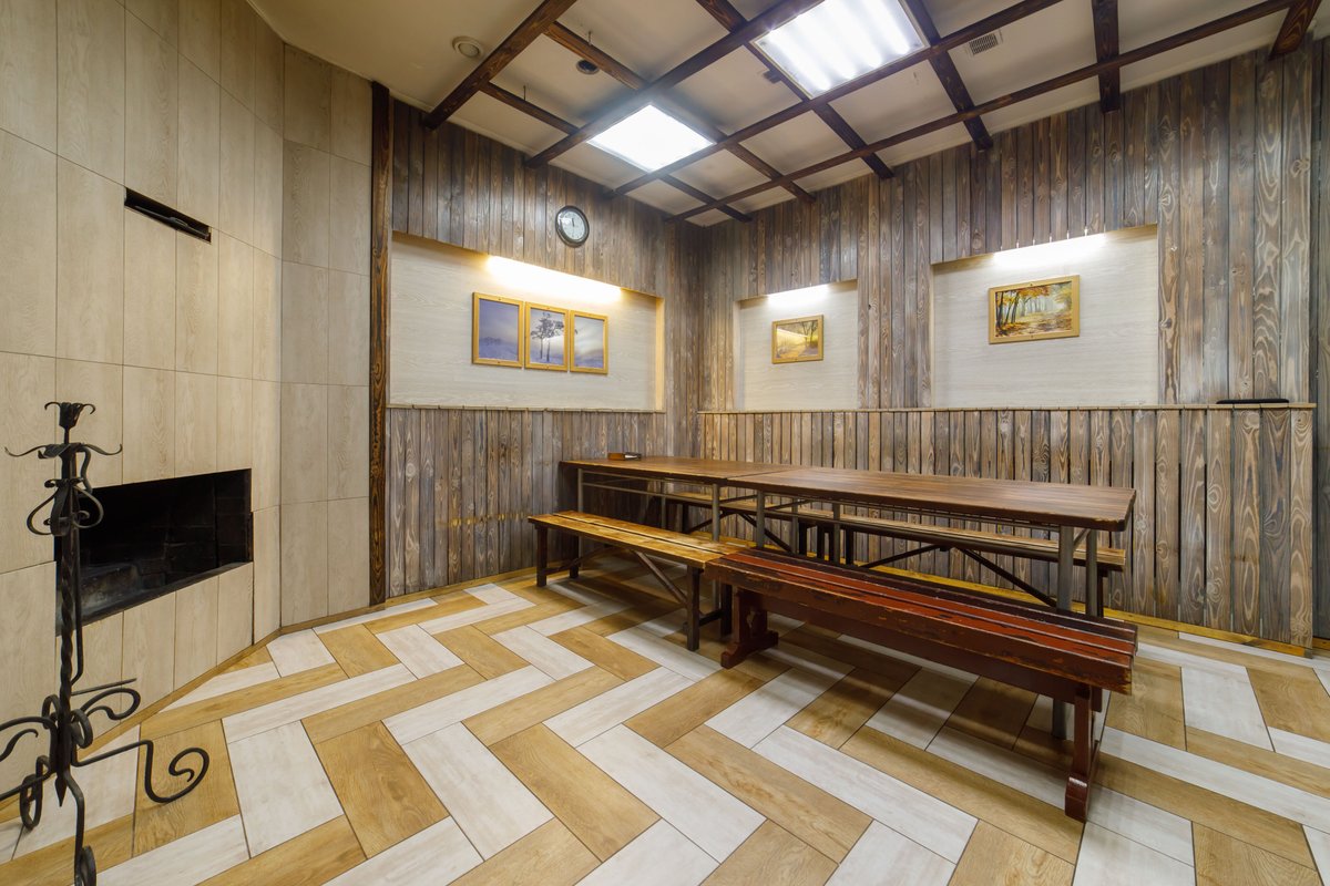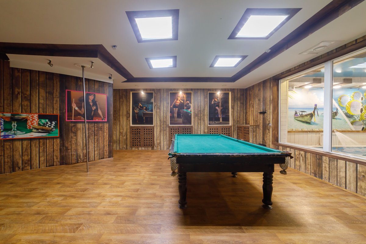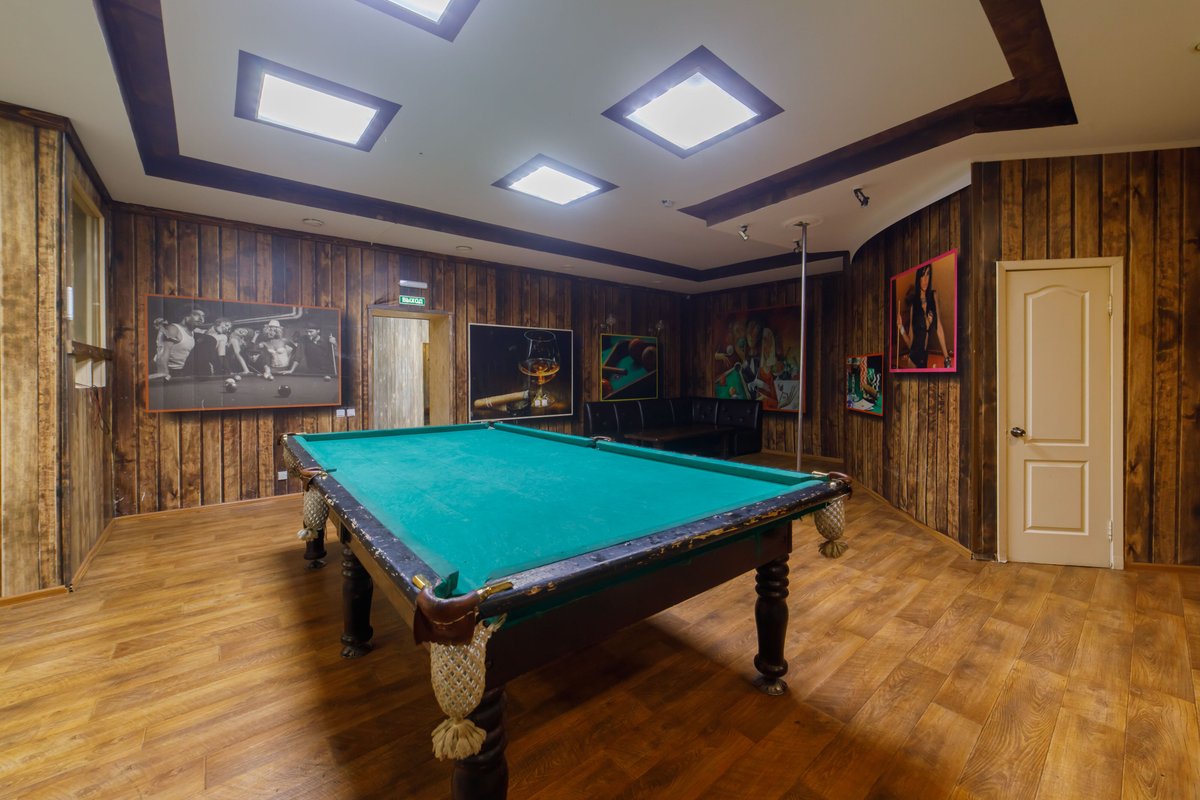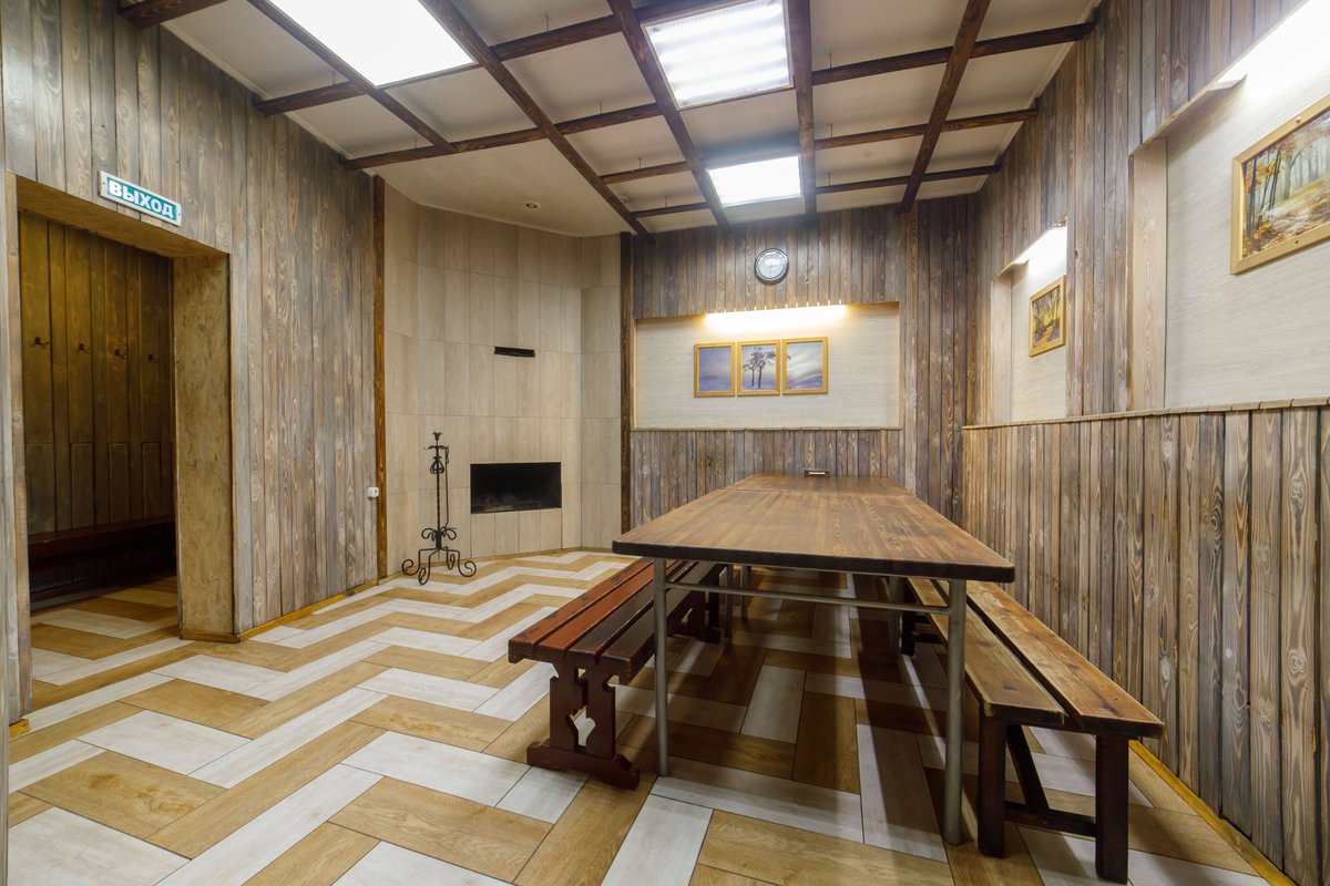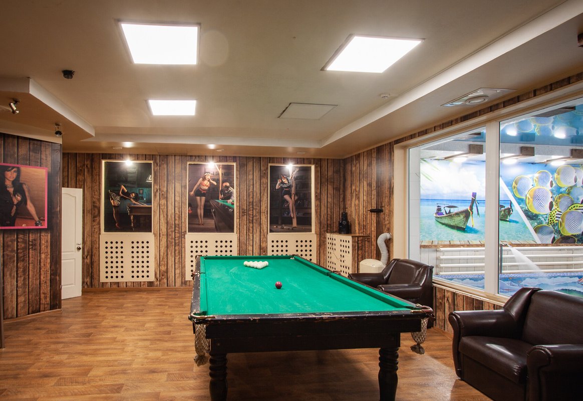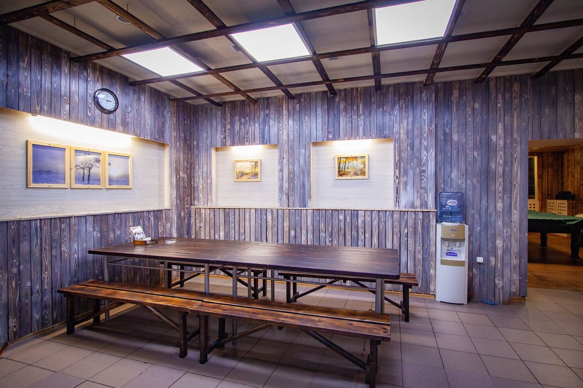 Не хочется в бассейн? Не проблема! Вместо этого можно посидеть в нашей комнате отдыха. Мы постарались создать здесь комфортный, стильный интерьер из максимально натуральных, экологичных материалов, выбрать мебель, которая будет одновременно удобной и эстетичной. Надеемся, что вы его оцените! Для создания настроения у нас есть бильярд, камин и караоке. Мы не располагаем собственной кухней, но не возражаем, если вы принесете еду с собой и совместите баню с импровизированным застольем. Только не забывайте, что плотная трапеза непосредственно перед посещением парной - это не самая хорошая идея, согласно мнению врачей. А вот после парной она совсем не повредит!
