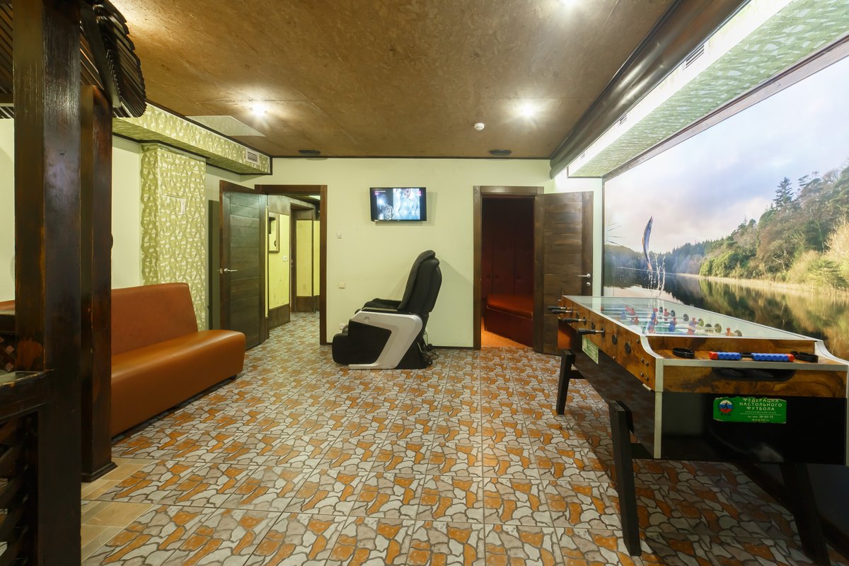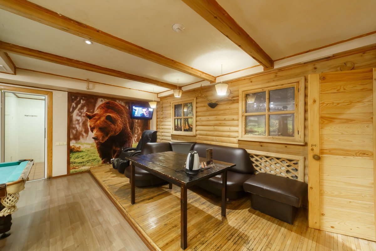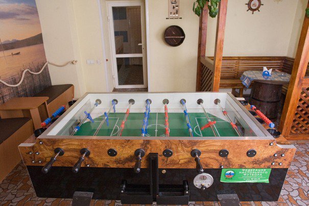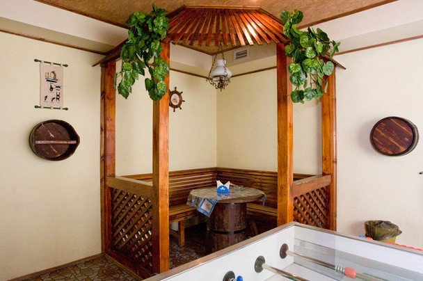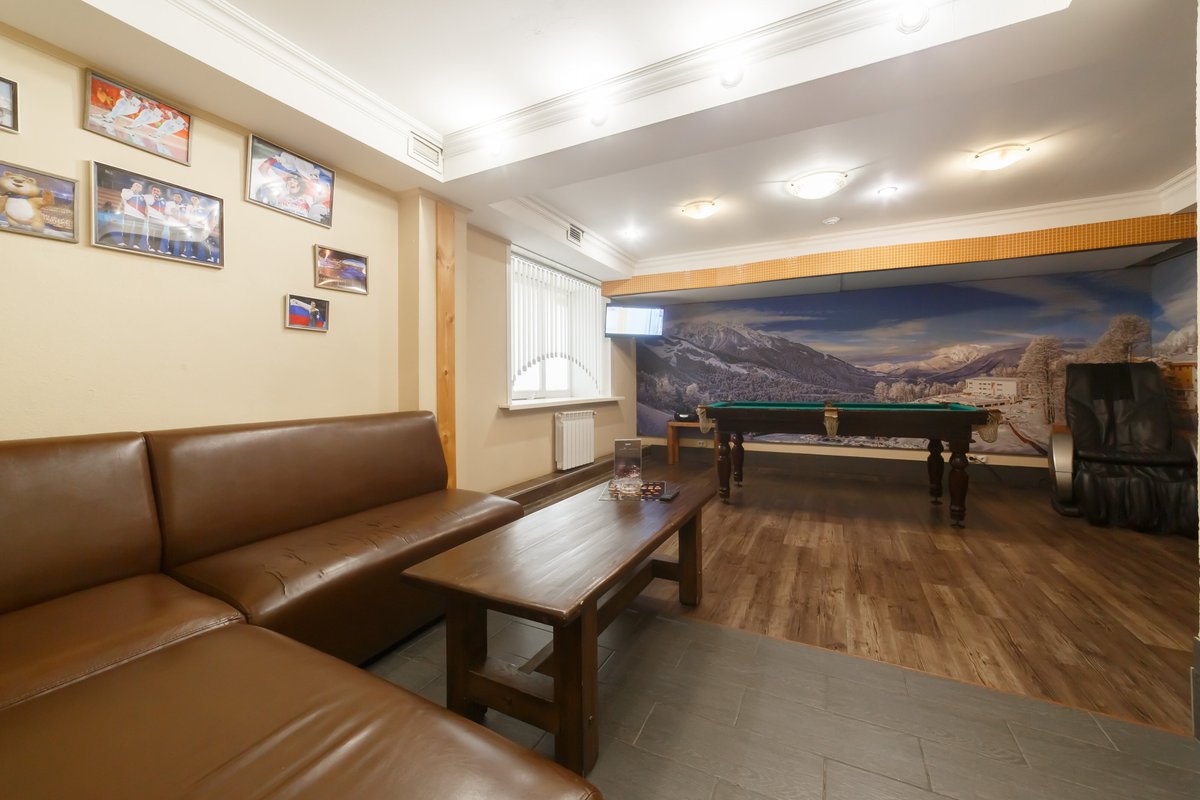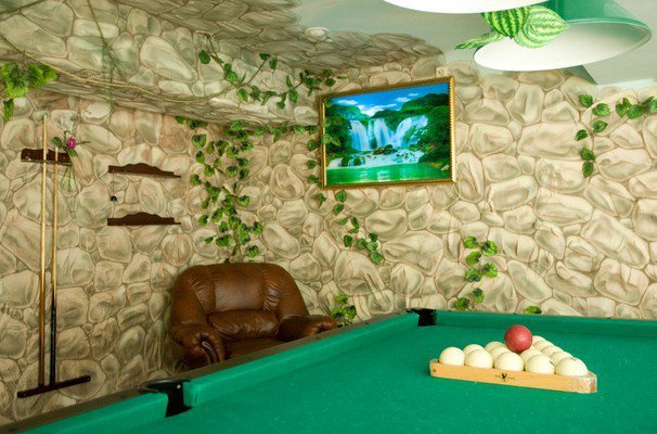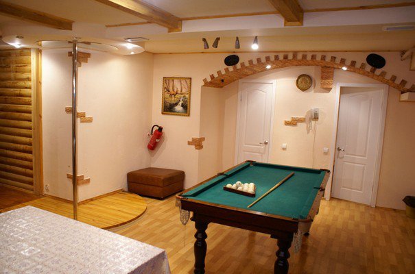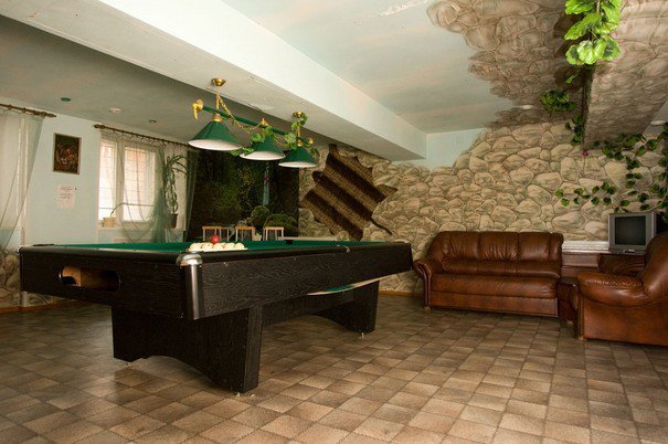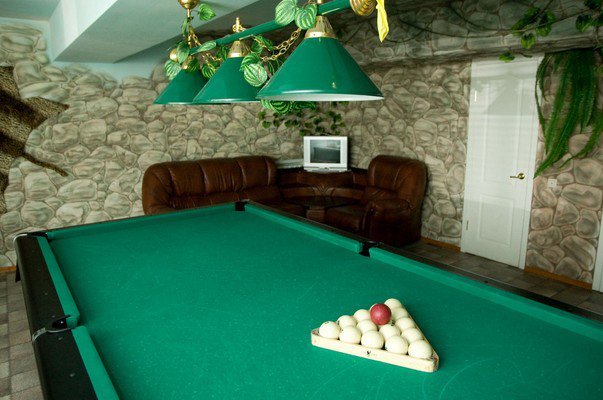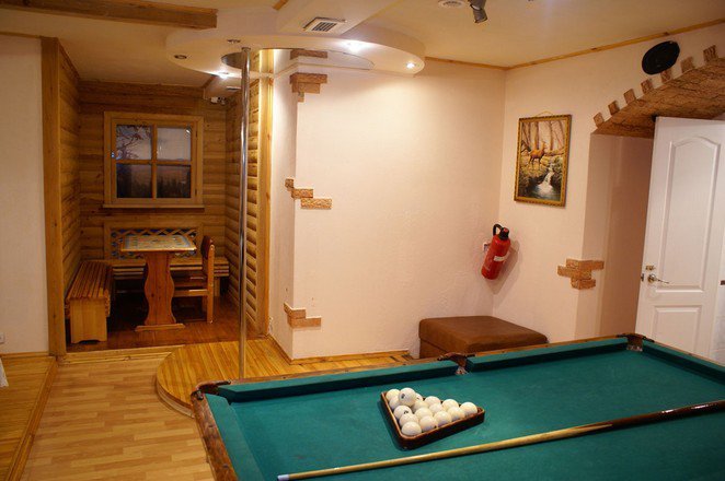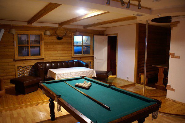 Не хочется в бассейн? Не беда! Вместо этого можно передохнуть в нашей комнате отдыха. Мы ставили своей целью создать здесь уютный, практичный интерьер из преимущественно натуральных, безопасных материалов, подобрать мебель, которая будет в равной степени удобной и эстетичной. Надеемся, что он придется вам по душе! Для поддержания атмосферы отдыха мы можем предложить вам бильярд.